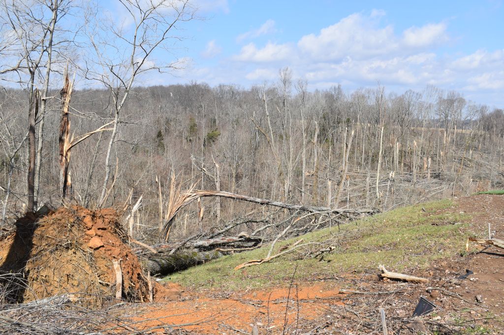 The damaged path of the March 3, 2020, Tornado up-rooted, snapped, twisted, and scattered trees in a path hundreds of yards wide and maintained contact with the ground for over 50 miles.